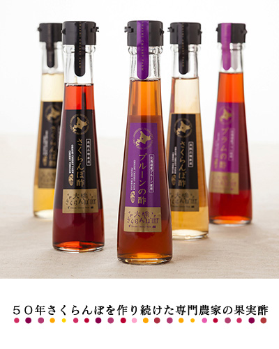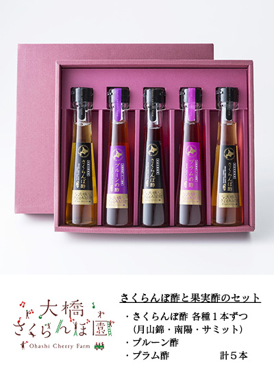 【「さくらんぼ酢(南陽)」「さくらんぼ酢(月山錦) 」「さくらんぼ酢(サミット)」「プルーン酢」「プラム酢」のセットです。】ラベンダーで有名な富良野市に隣接する北海道芦別市でさくらんぼ生産を50年以上続ける大橋さくらんぼ園。収穫時期の7・8月はとくに昼と夜の寒暖差がとても大きく、糖度が高く品質の良いさくらんぼの栽培に適しています。この地で「土づくり」からこだわり、化学肥料を使わず堆肥と有機質肥料だけで美味しいさくらんぼを生産している、大橋さくらんぼ園の「さくらんぼ酢と果実の酢セット」です。高級品種の「南陽」、「月山」、「サミット」を使用し、マイナス20℃を下回る北海道の厳しい寒さを積極的に活用して微生物の繁殖を防ぐ静置発酵で約一年かけて熟成させた「さくらんぼ酢」をはじめ「プルーン酢」「プラム酢」をセットにしました。薬品、添加物に頼らない昔ながらの製法で作ったフルーツビネガーをぜひご賞味ください。