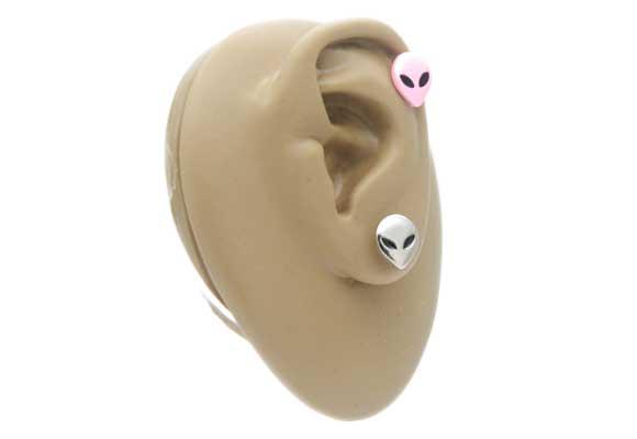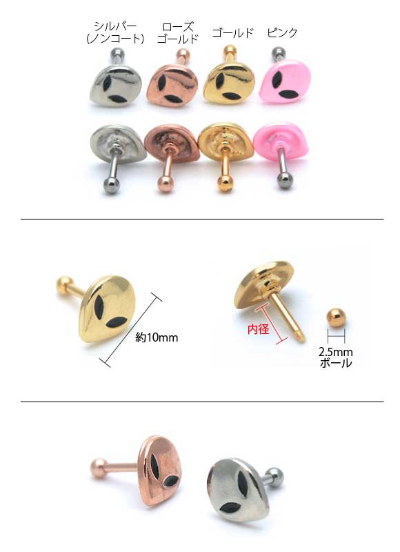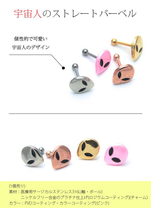 本日P2倍 16G ピアス ボディピアス グレイ 宇宙人 ストレートバーベル 宇宙 金属アレルギー対応 316L 高品質 ステンレス 軟骨ピアス