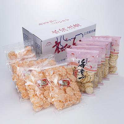 【醤油味とフライ塩味の海老せんべいの食べ比べができるセットです。】海老せんべい発祥の地と言われる三河湾に面する愛知県西尾市一色町。明治時代半ばにアカシエビを主原料で作られたものが起源とされ、現在も全国の海老せんべいの約6割がこの三河・一色町で生産されています。そんな一色町で手焼きにこだわって昔ながらの海老せんべいやいかせんべいの製造・販売を行う富士見屋の「海老せんべい食べ比べ 醤油x5フライ塩味x5」です。海老の身と澱粉を混ぜ合わせ手焼きして醤油で味付けした「醤油」、材料をカラリと油で揚げて塩味で仕上げた「フライ塩味」。おやつやお茶請けに、本場三河・一色の風味豊かな海老せんべいをお楽しみください。