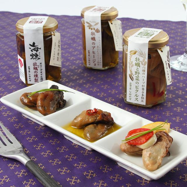 送料無料 牡蠣の旨みと香りが味わえる3本セット〈 海組の二 〉アヒージョ・燻製オリーブオイル漬け・ピクルス