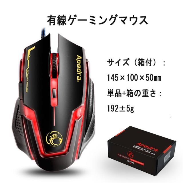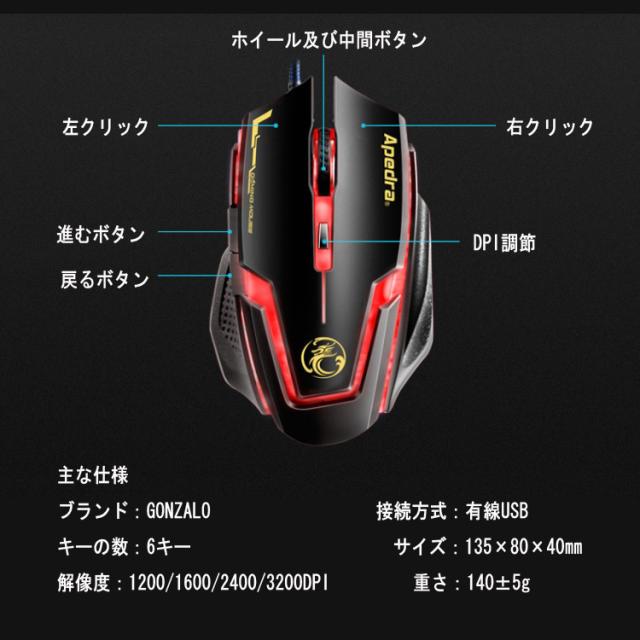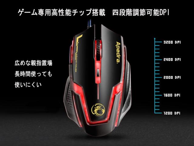 ゲーミングマウス 高解像度 6ボタン LED 有線 XP Win7 Win8 VISTA Win10 光学式 USB接続 4段階切替 4色変換 3200dpi usbマウス 正規品