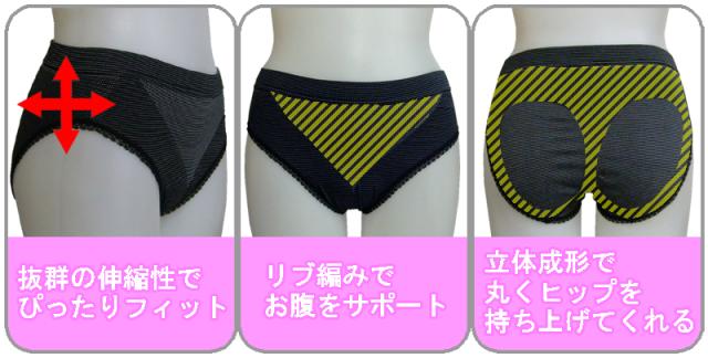 伸縮性のある立体成形で、お腹部分は引き締め、ヒップ部分は丸く持ち上げてくれます