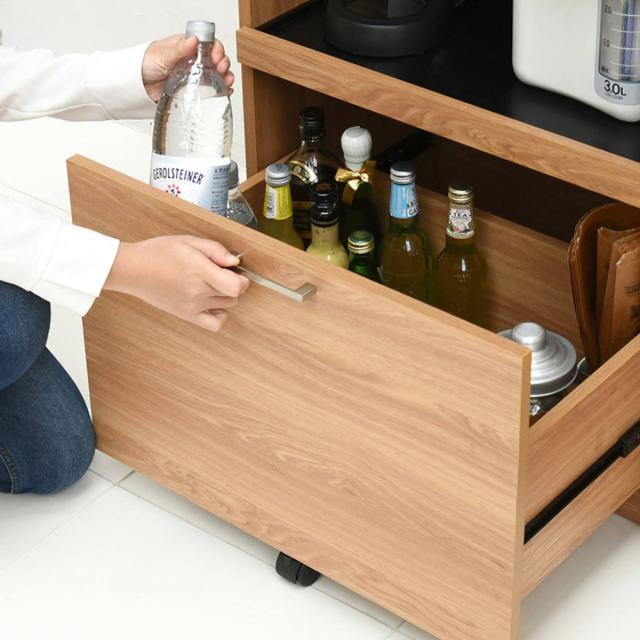 深型引き出しの中央にキャスターが付いていることで開け閉めの際に前倒れせず、スムーズに取り出せます。