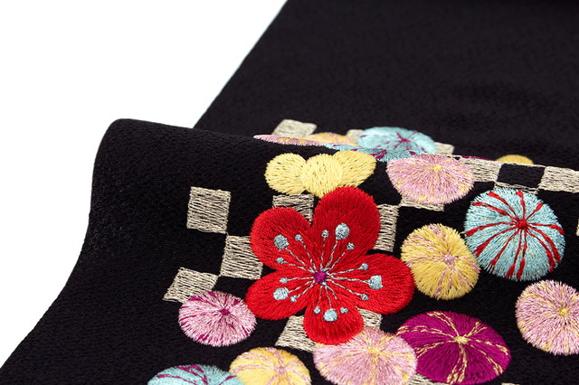 高級感のある縮緬の生地に市松格子、梅の花と鞠の刺繍が施されています。