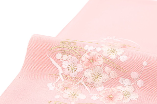 金色の金属糸で煌めく流水に、梅や菊、竹が刺繍されています。