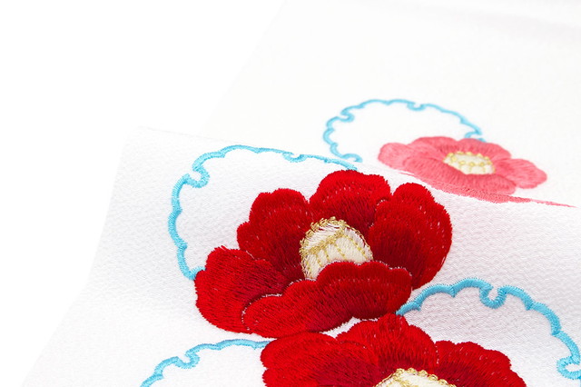 高級感のある縮緬の生地に、大柄の椿に雪輪の柄が刺繍されています。