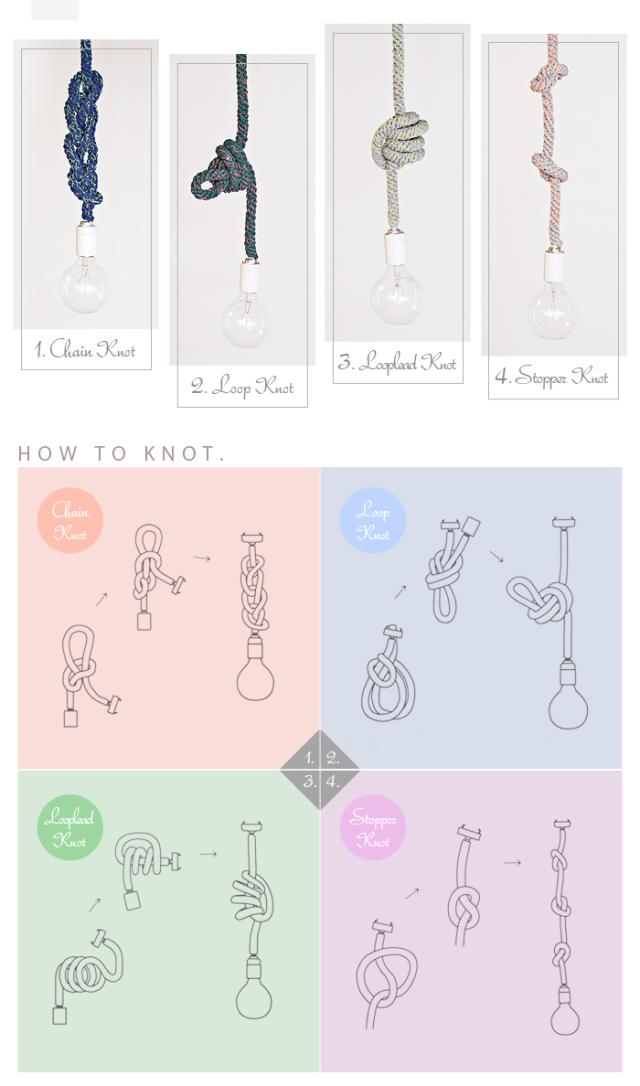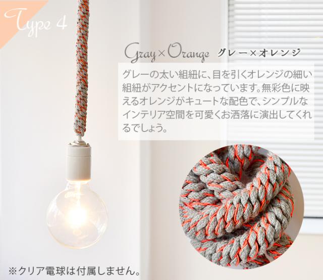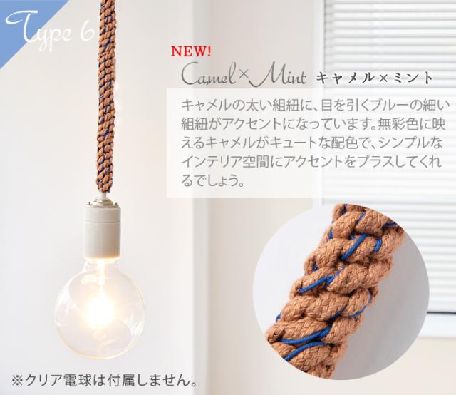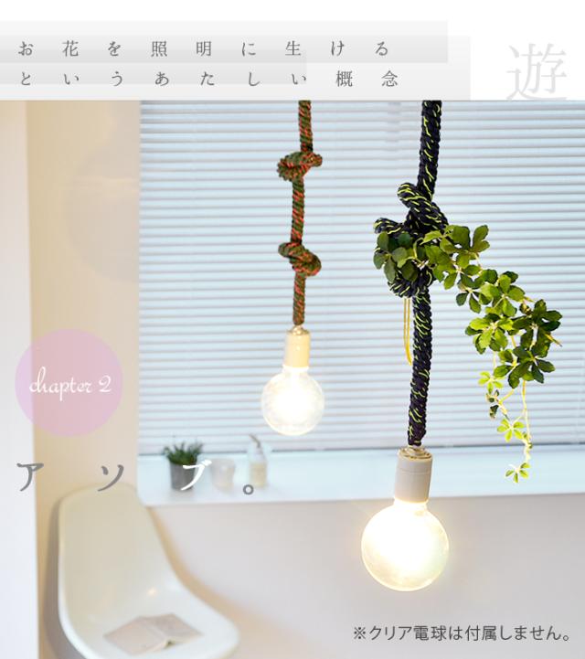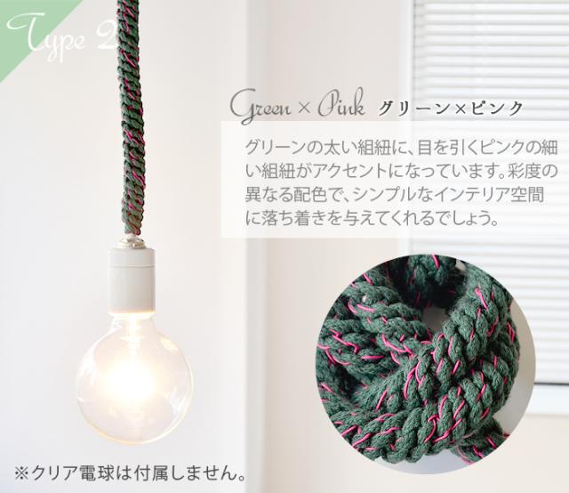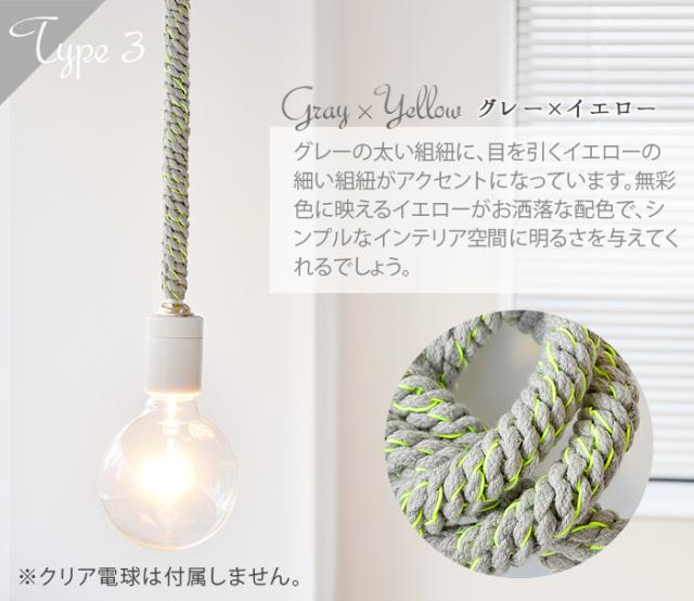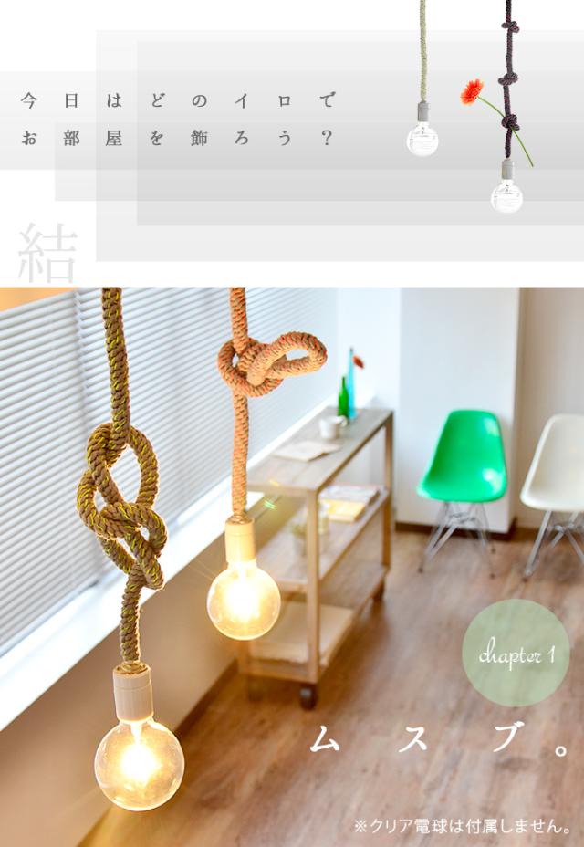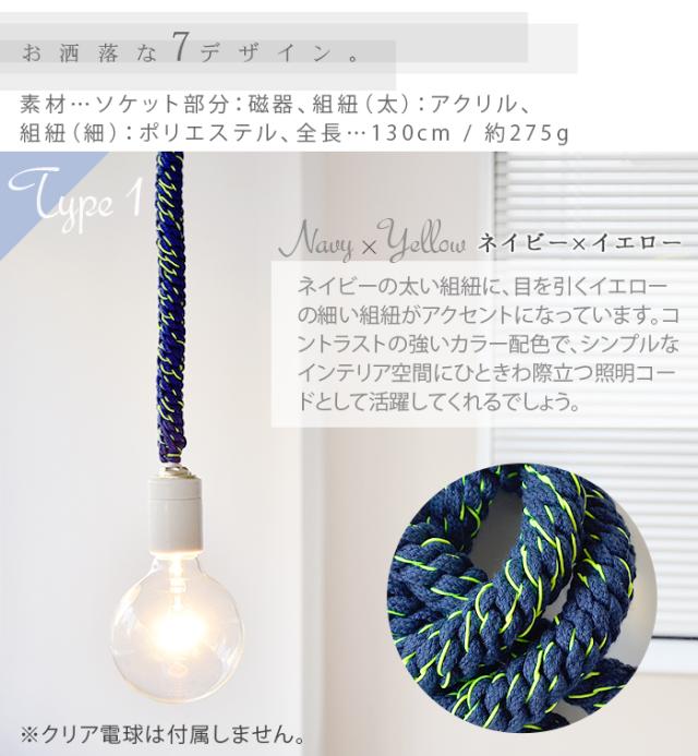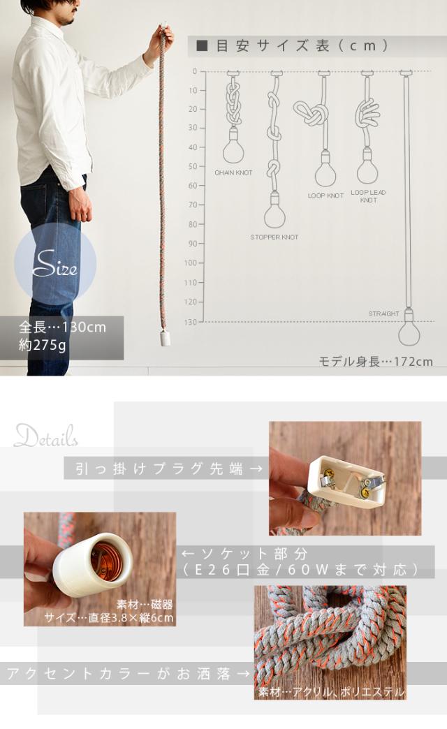 ロープの様な太いヒモに、アクセントが効いた蛍光カラ—とのコントラストがとってもユニークな電球コード。ありそうで無かった新しいデザインがお部屋の雰囲気をお洒落に演出してくれます。130cmもある長さを有効活用する術、それは、ご覧の様にあなた好みの結び目を与えてあげる事。あなたも、「照明」に新鮮な概念をプラスしてみて下さい。