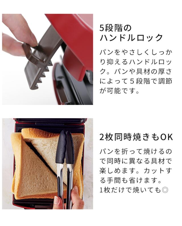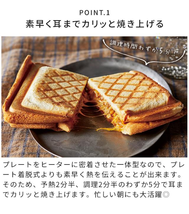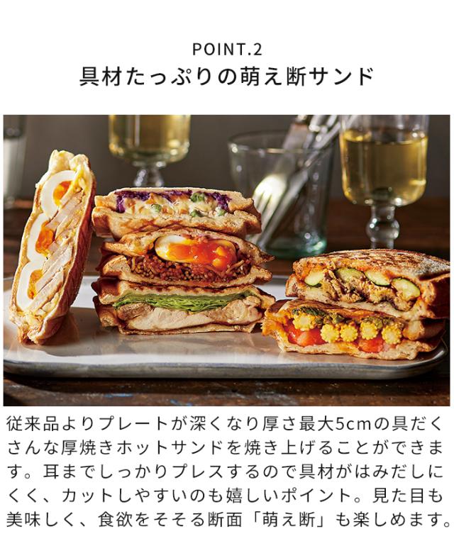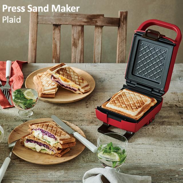 かわいいキルト模様のホットサンドが簡単に焼ける人気のプレスサンドメーカーのリニューアルモデル「プラッド」が登場!従来品よりプレートが深くなり、厚み最大5cmのボリュームサンドを作ることが出来ます◎熱伝導に優れた固定式プレートで、余熱を含め約5分という素早さで耳までカリッ、中はしっとりと焼き上げます。定番からアレンジまで充実の50品目を掲載したレシピブック付き!作って楽しい、食べておいしいホットサンドを手軽に堪能できます♪