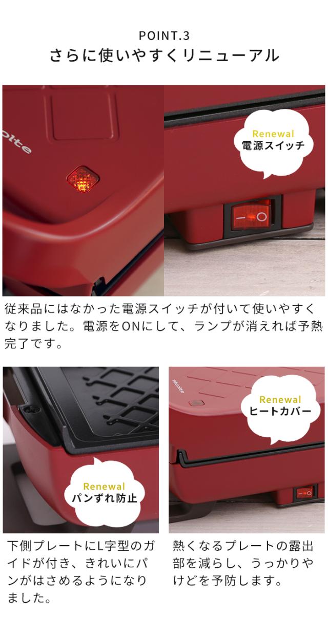 - 前のタイプを長年使っていましたがこびりつりがでてきたので新しいタイプに買い替えました。 蓋を閉めるところが数段階になっているので厚みのあるサンドも閉じやすくなってます。 オンオフのスイッチが付いたのも...