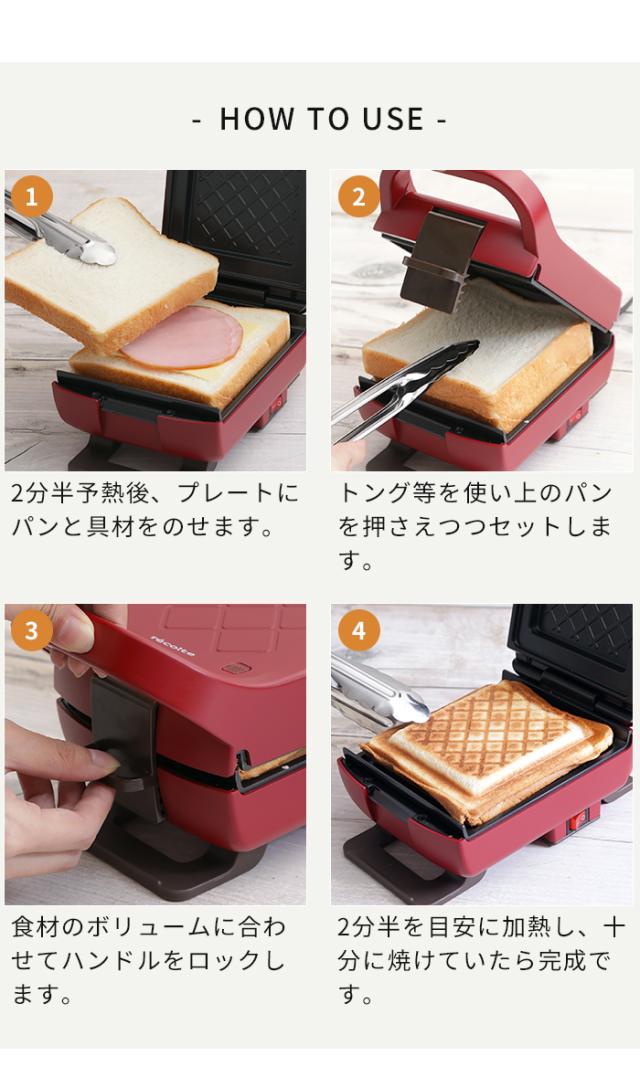 ・焼き時間は付属の専用レシピに書かれた時間を目安にしてください。 ・以下の食材はプレートの間から漏れ出し、やけど・故障の原因になるので調理しないでください。 ■液だれの多い食材(ジャムなど) ■加熱により膨らむ材料(モチ、はんぺんなど) ■生地を流し込む材料(パンケーキなど) |