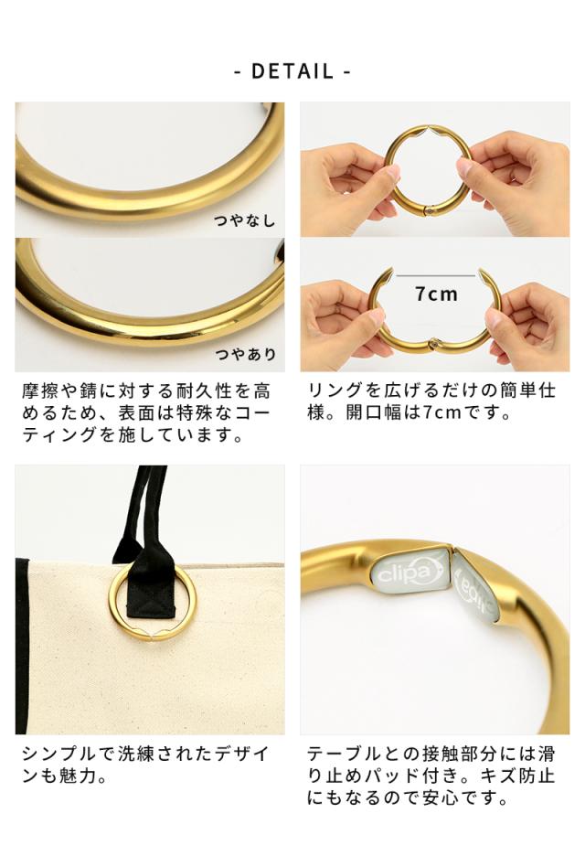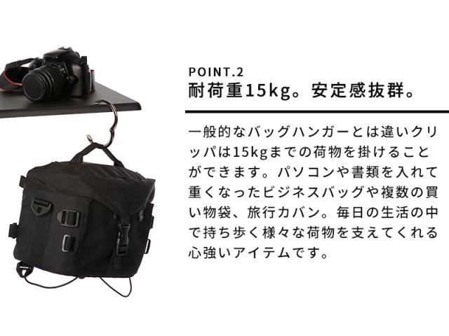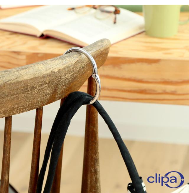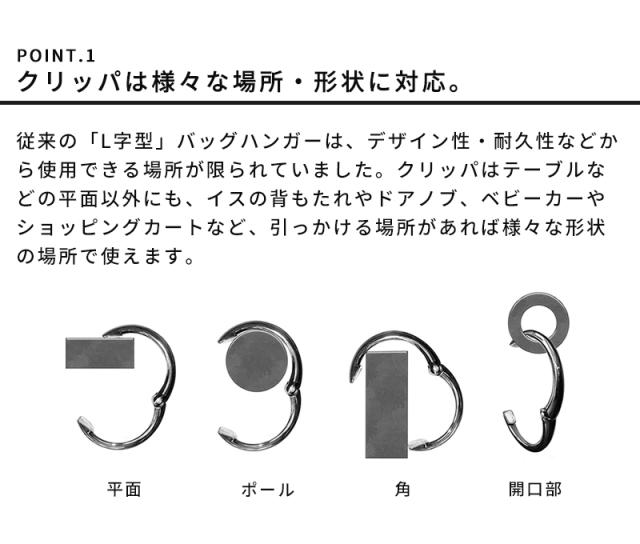 手荷物の置き場所に困った時に、身近にな場所に引っかけられるバッグハンガー「clipa クリッパ」。耐荷重が2〜3kgの一般的な「L字型」バッグハンガーとは違い、クリッパは15kgまでの荷物を掛けることができます。テーブルなどの平面以外にも、イスの背もたれやドアノブ、ベビーカーやショッピングカートなど様々な形状に対応◎洗練されたシンプルなデザインは、性別や年齢に関係なくお使い頂けるので、ギフトとしてもおすすめです。