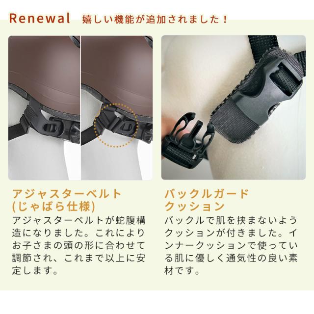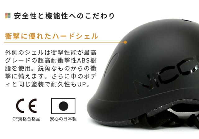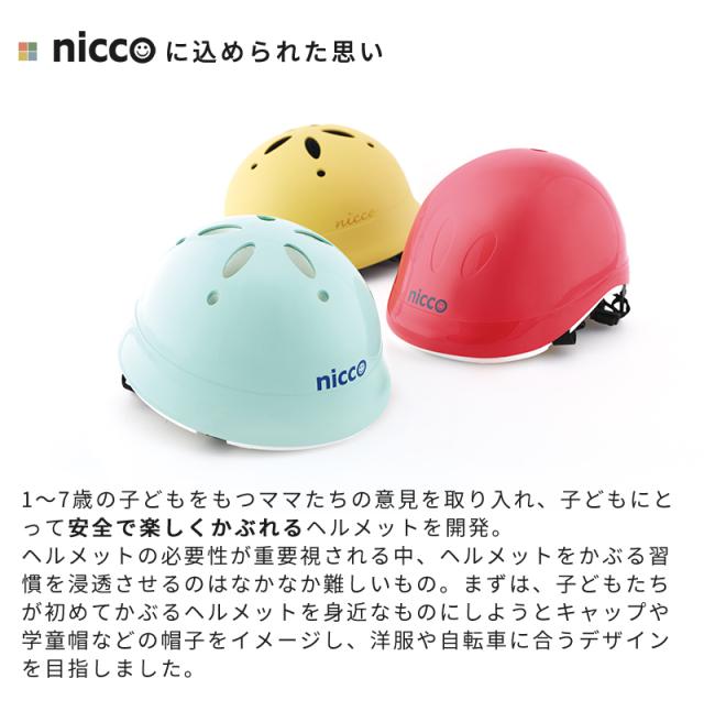 普段の生活にとけこむ、シンプルでおしゃれな「nicco(ニコ)」のこども用ヘルメットです。「ハードシェル」と「複合発泡」の採用で、コンパクトでも十分な安全性を実現しました。衝撃性に優れたハードシェル、かぶりやすくずり落ちにくいベルトの仕様、インナーパッドは取り外して水洗い可能と、機能性もバツグン。浅めのかぶりで小さな頭でも目にかからず、お子さまが安全に気持ちよくかぶれる工夫もされています。