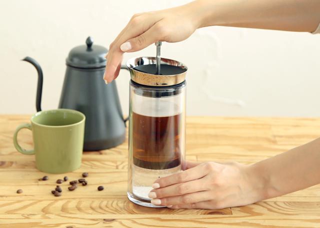 焙煎したコーヒー豆そのものの味わいを本格的に抽出し、コクがありながらもスッキリとしたコーヒーを楽しむことができる「アメリカンプレス」。おしゃれなデザインで、使い方もとっても簡単。極細スチール製フィルターが付いたポットにコーヒー粉を入れ、お湯の入った容器に手で押さえながら抽出するだけ。お湯の温度や蒸らす時間などお好みで調整が出来ます。抽出後のコーヒーカスはポットからそのままゴミ箱に捨てるだけなのでお手入れも手軽に出来るのが嬉しいポイントです。また、コーヒーだけでなく、紅茶などの茶葉の抽出も出来ます。