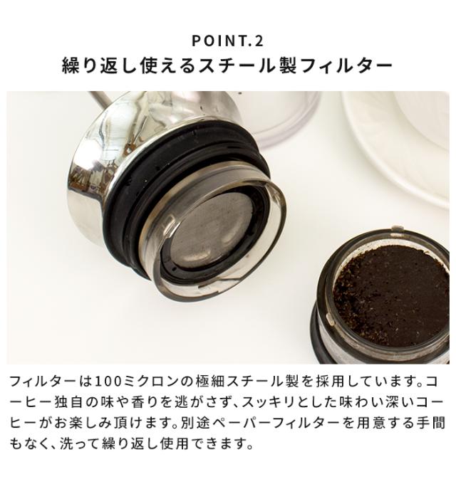 - 彼氏がずっと欲しがってたのでプレゼントで購入しました。片付けも簡単だし、毎回安定した味で市販の粉でもとても美味しい珈琲が飲めるので買って良かったです。 発送も早かったし商品に少し不具合もありましたがすぐに対応してもらえました、ありがとうございました。