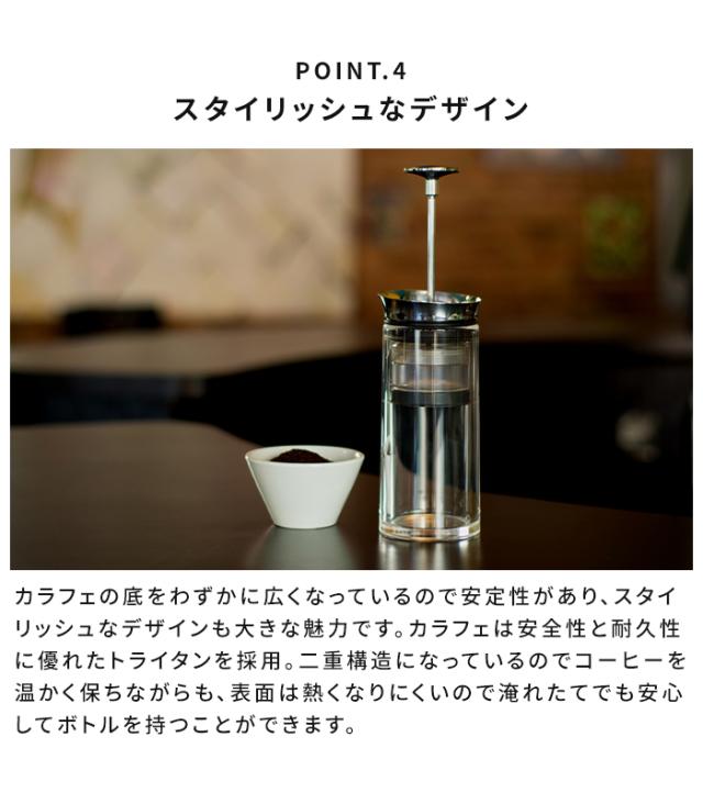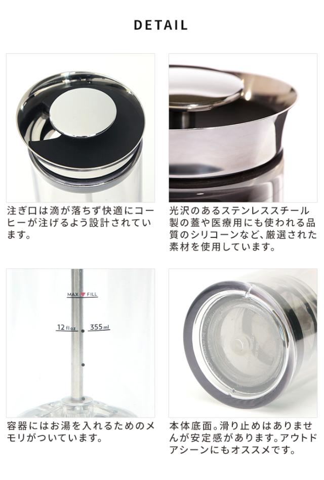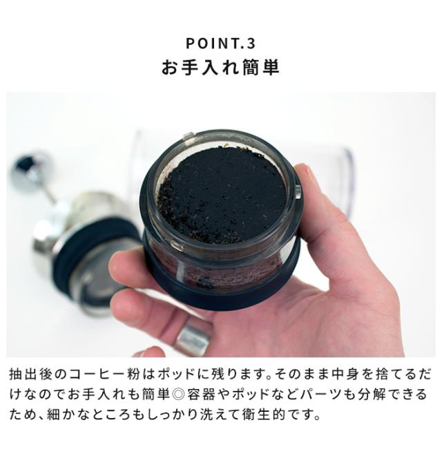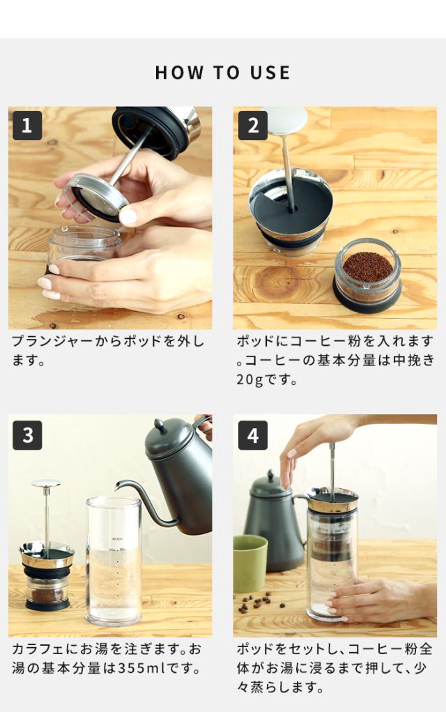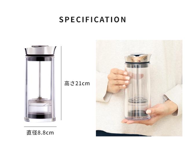 | 素材 | ポッド・容器:トライタン(飽和ポリエステル) 蓋:ステンレス パッキン:シリコーン フィルター:ステンレス(100ミクロンの極細スチール製) プランジャー:アルミ、ステンレススチール |