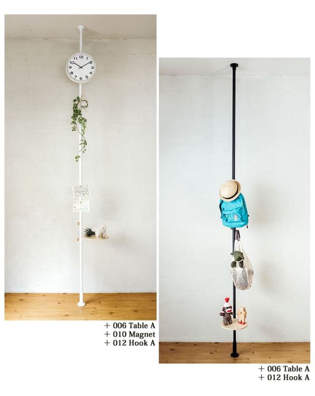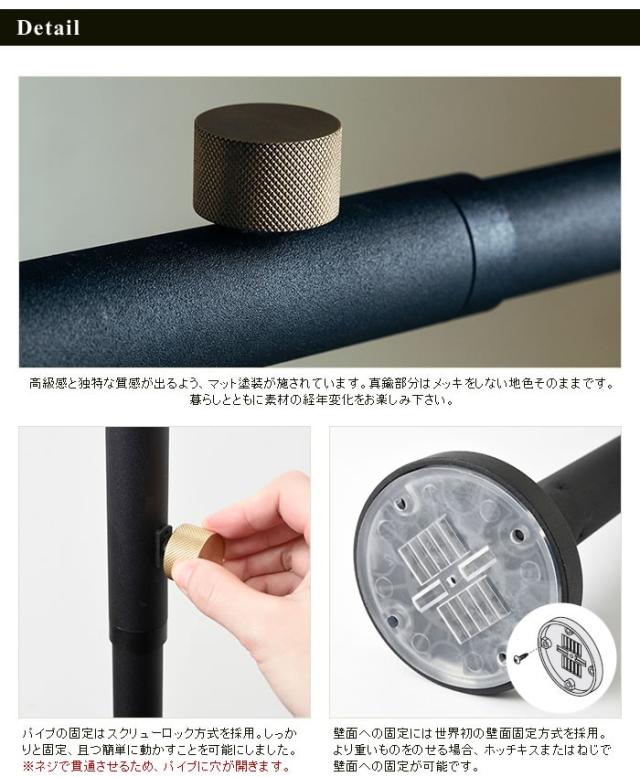 | 備考 | ・この商品は屋内用です。他の用途には使用しないでください。 ・本製品は、ねじ、釘を使わずに支柱を天井と床に強力に圧着して取り付けますので、下地のしっかりしている場所に取り付けてください。 ・圧着固定式ですので、ねじ類はしっかり締め付けてください。弱いと本体の転倒の原因になります。 ・固定時パイプをネジで貫通させるため、パイプに穴が開きます。 ・スチール部分はマット塗装を施しているため、硬いものの先端などが当たると傷がつきやすくなっています。 ・表示耐荷重の範囲内でご使用ください。耐荷重は実験値で保証値ではありません。 |
