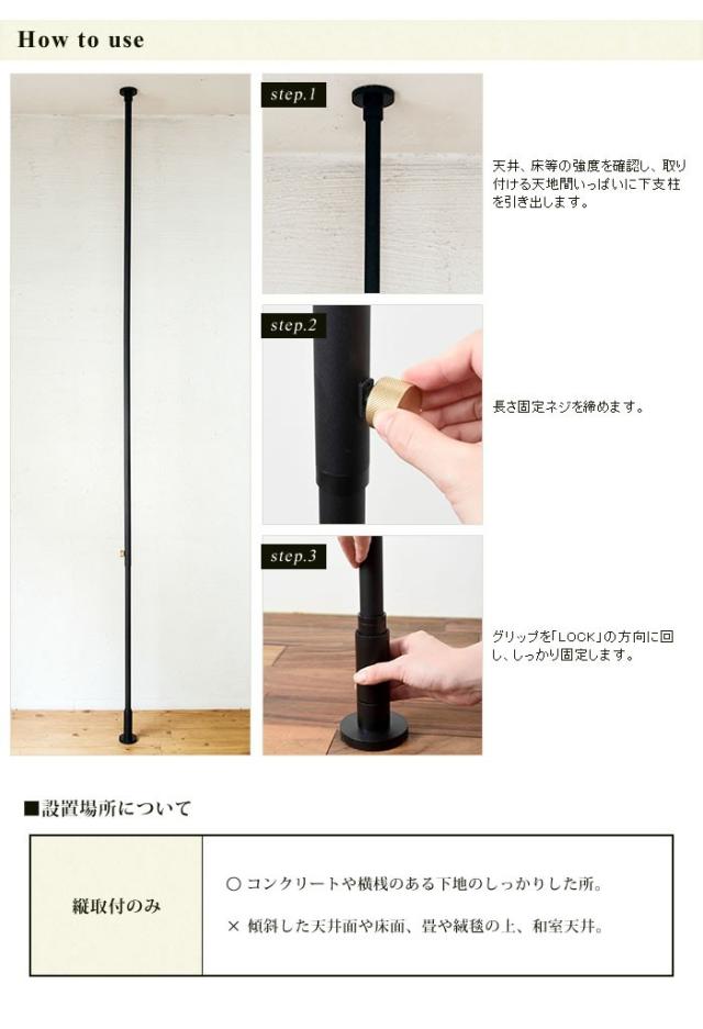 ・本製品は、ねじ、釘を使わずに支柱を天井と床に強力に圧着して取り付けますので、下地のしっかりしている場所に取り付けてください。