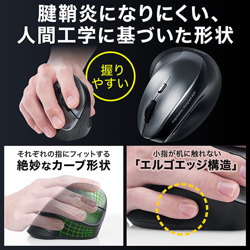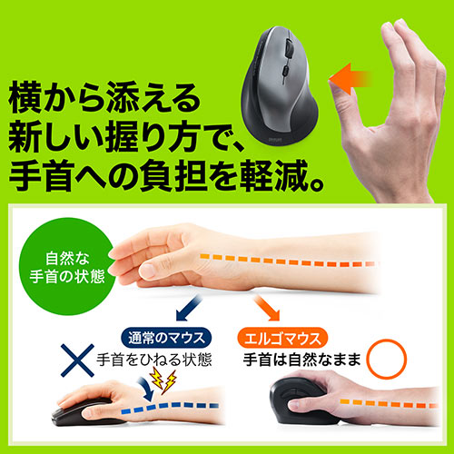 ●手首の疲れを軽減するエルゴノミクス形状のマウスです。●手の側面が机と擦れない形状になっています。