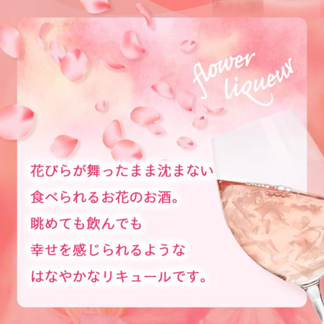 花びらが舞ったまま沈まない食べられるお花のお酒。眺めても飲んでも幸せを感じられるようなはなやかなリキュールです。