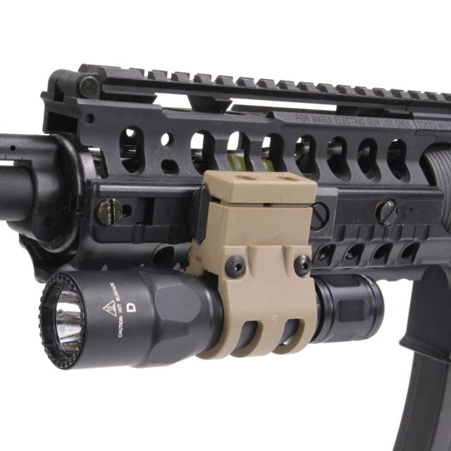 TACのフラッシュライライトマウントは、銃器のサイドレールに装着した際に視界を遮ることなく、またライトがレールより低い位置にきます。そのためフォアグリップを握ったまま親指でライト後部のプッシュボタンを押すことができるので、スムーズにライトのON/OFFが可能です。