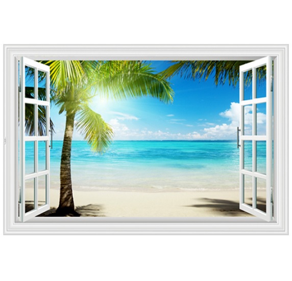 ウォールステッカー 窓枠 ヤシの木とビーチの風景 水平線 壁紙シール 南の島 リゾート気分 眩い日差し 砂浜 はがせる ウォールシール