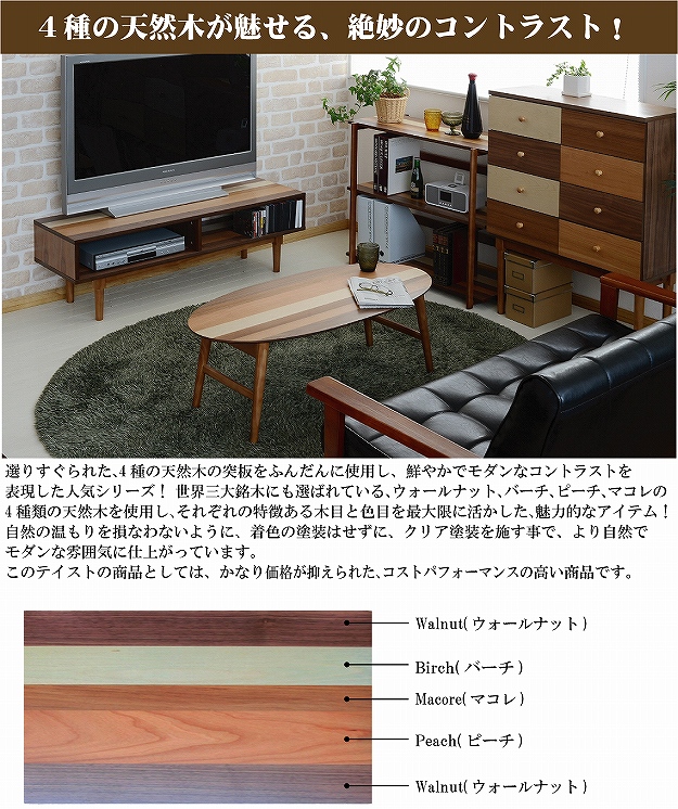 こちらの商品は、選りすぐられた4種類(ウォールナット、バーチ、ピーチ、マコレ)の天然木の突板を使用することで、個性的で温もりのある見事なコントラスを演出した商品です。