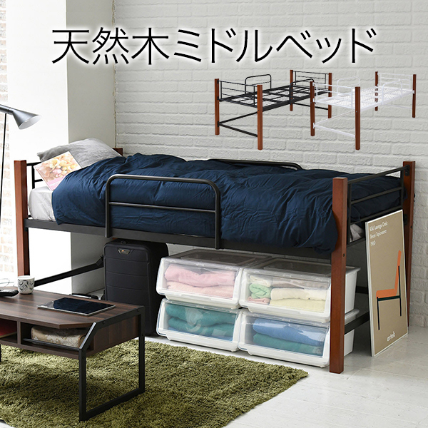 天然木脚 ミドルベッド シングル パイプベッド 高さ 96 長さ 209 木製 ロフトベッド ロータイプ 天然木 頑丈 丈夫 有効活用 新生活 極太ブラック JKプラン IRI-1041-BKBR【送料無料】 (IRI1041BKBR)