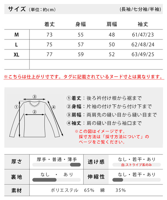 | 七分袖・サイズ | 着丈 | 身幅 | 肩幅 | 袖丈 |