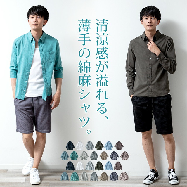 シャツ メンズ 綿麻 長袖 七分袖 7分袖 夏 涼しい ストレッチ エアリー シンプル スモーキーブルー 仕事 レギュラーカラー カジュアルシャツ おしゃれ ビジネス クールビズ 定番 カジュアル フレンチ アッシュカーキ 麻 ギンガム プレゼント