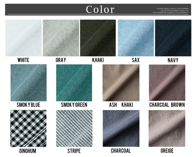 | ホワイト グレー カーキ サックス ネイビー スモーキーブルー スモーキーグリーン チャコールブラウン アッシュカーキ ギンガム ストライプ チャコール グレージュ |