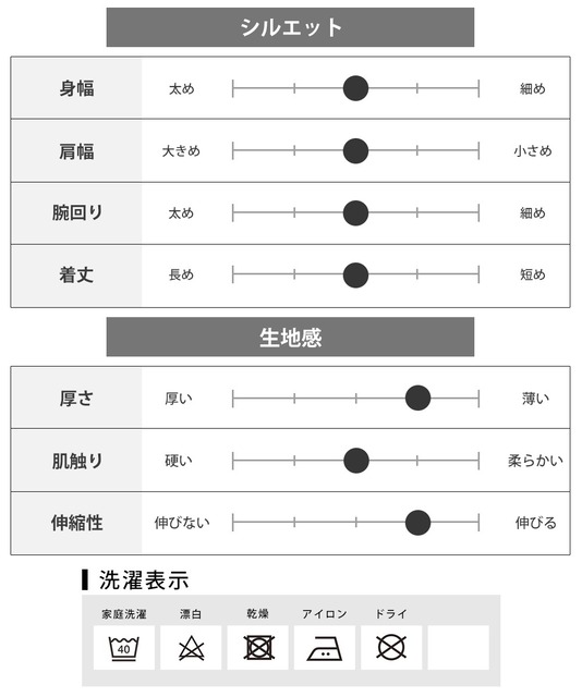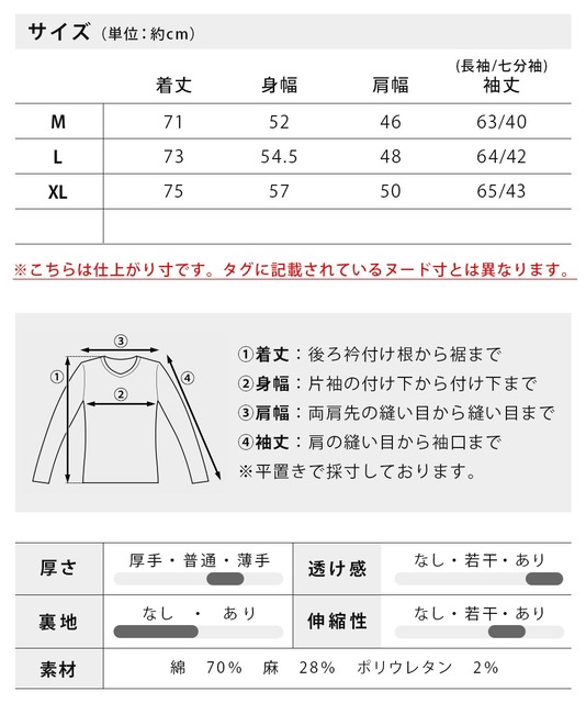 | 長袖/七分袖・サイズ | 着丈 | 身幅 | 肩幅 | 袖丈 |