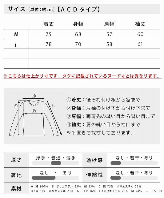 | A.C.D・サイズ | 着丈 | 身幅 | 肩幅 | 袖丈 |