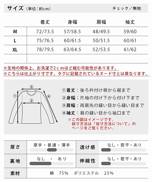 | チェック・サイズ | 着丈 | 身幅 | 肩幅 | 袖丈 |