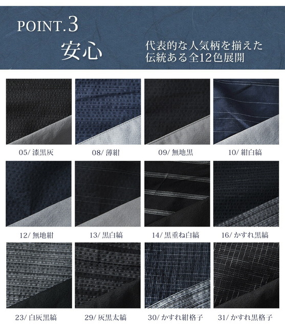 | 漆黒灰 薄紺 無地黒 紺白縞 無地紺 黒白縞 黒重ね白縞 かすれ黒縞 白灰黒縞 灰黒太縞 かすれ紺格子 かすれ黒格子 |
