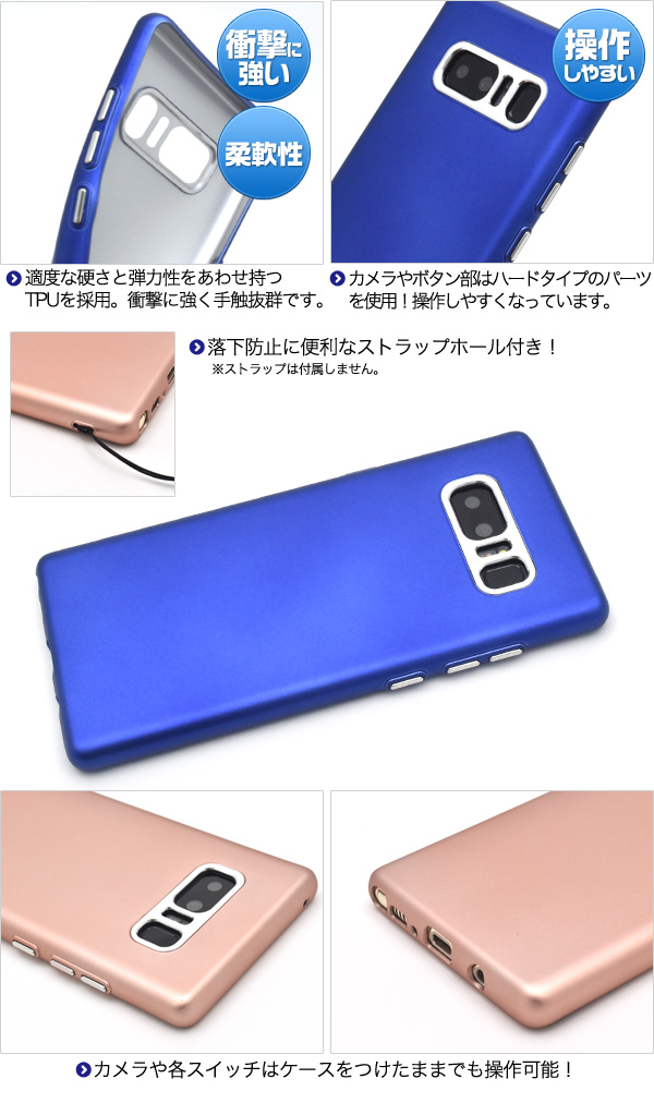 メタリックカラーがスタイリッシュなGalaxy Note8用ソフトケース。Galaxy Note8本体にぴったりフィット!キズやホコリ・指紋等から守ります。もちろん、充電や各スイッチはケースをつけたままでも操作可能です。 素材は適度な硬さと弾力性をあわせ持つTPUを採用。衝撃に強く耐久性に優れ、手触りも抜群です。カメラ穴やボタン部はハードタイプのパーツを使用!操作しやすくなっています。また、側面には落下防止に便利なストラップホールもついています。