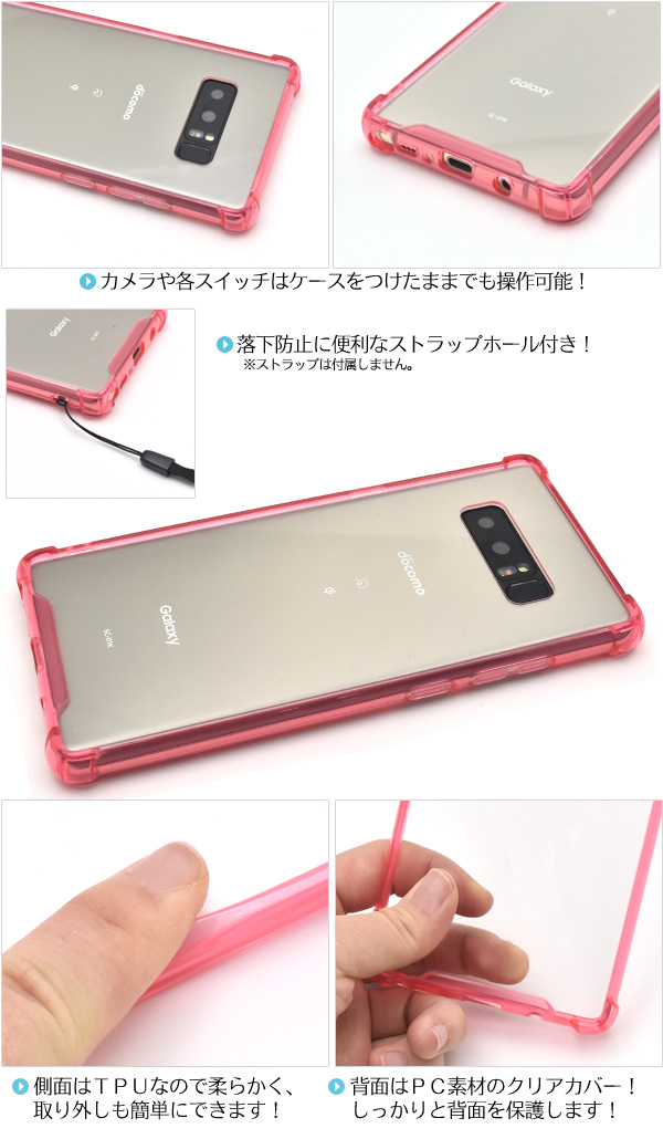 Galaxy Note8用カラーバンパークリアケース! 衝撃やキズ、埃などからしっかりとGalaxy Note8を守ります。側面はTPU素材なので柔らかく、取り外しも簡単!また、背面は硬めのPC素材なので、しっかりと背面を保護します。角の部分を液晶や背面より高く設計! 落下時に液晶画面や背面にダメージを与えにくい構造になっています。もちろん、装着したまま充電や各種ボタンの操作も行えるようにデザインされています。 落下防止に便利なストラップホール付きです。