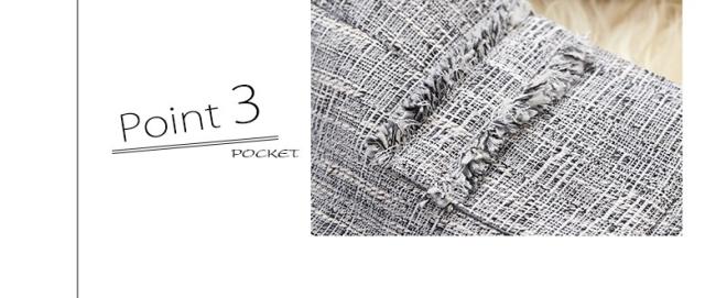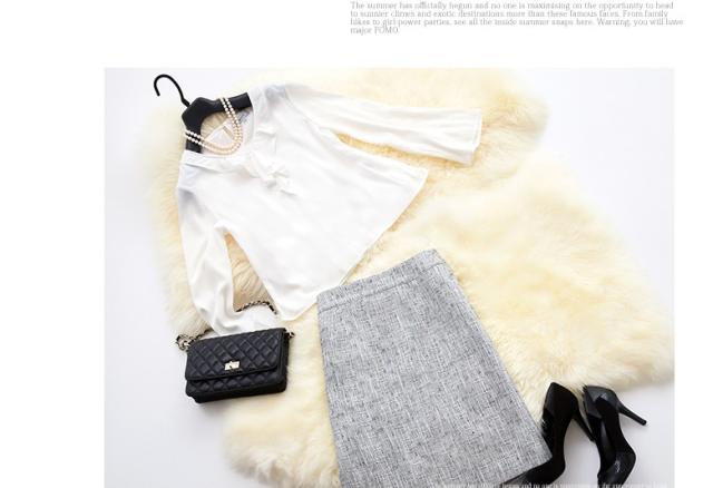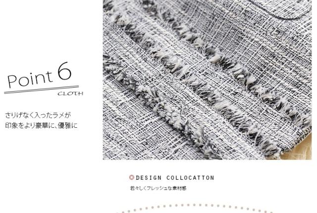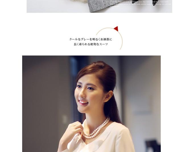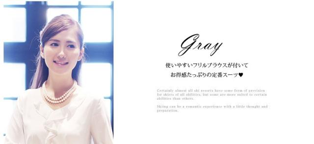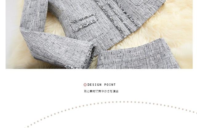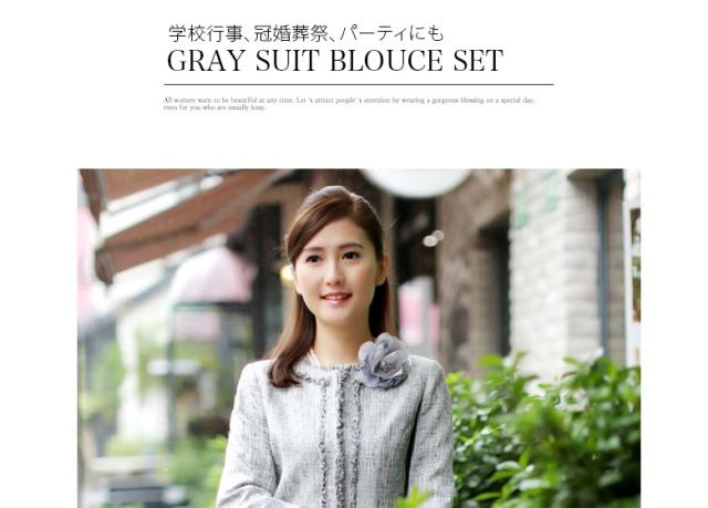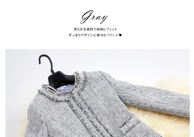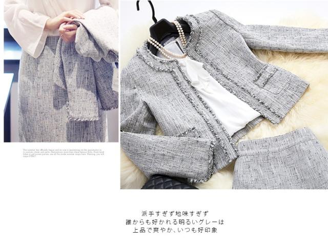 ● フリンジ使いが軽やかな印象の3点セット。きちんとしたいいろいろなシーンに使いやすい明るいグレーのスーツと、白いブラウスのセットです。