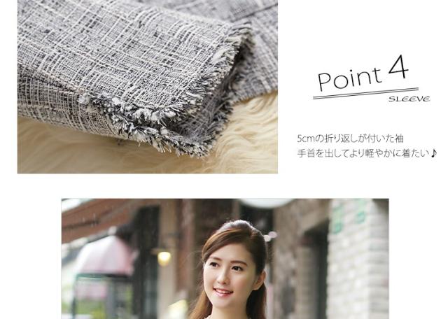 ● 手首を見せられる袖の折り返しが、さらに印象を軽やかにします。ジャケットには物を入れられるポケットがあって実用的。
