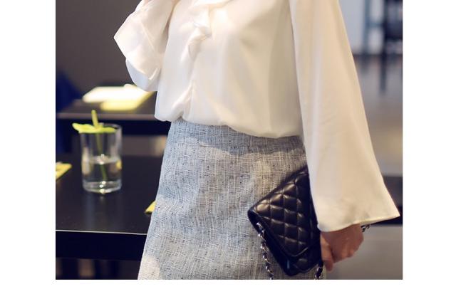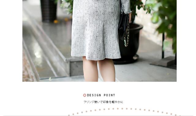 ● ジャケットもスカートも、身体にフィットする柔らかなデザイン。ほどよくあしらわれたフリンジが軽やかさと若々しさを表現。