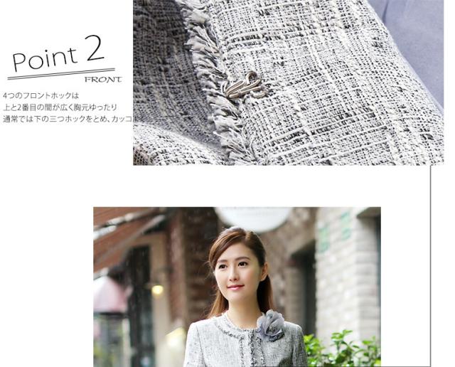 ● ジャケットのフロントホックは4つ。胸元を締め付けないよう、上の二つのホックの間は幅を広く取ってあります。