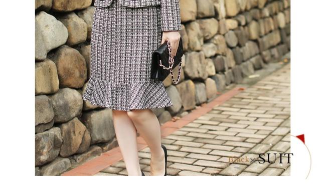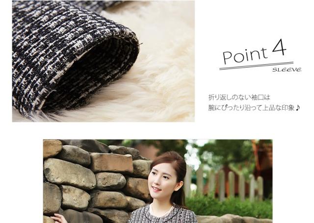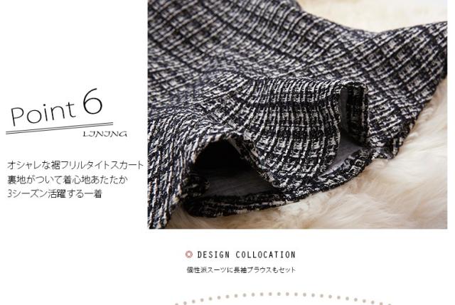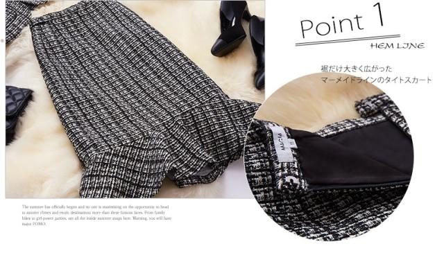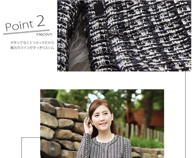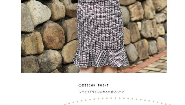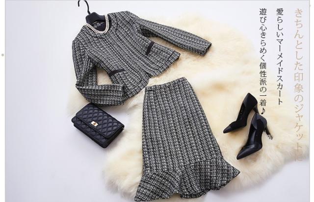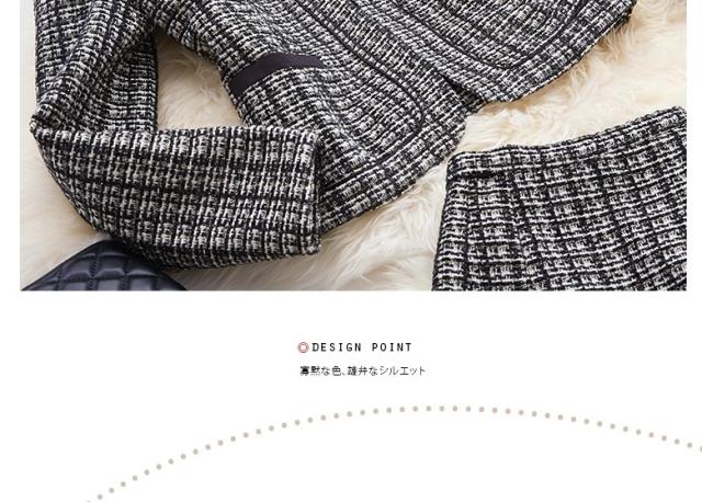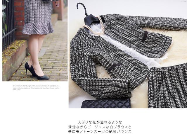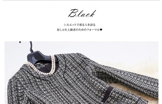 ● 裾だけ大きく広がったタイトスカートが、華やかなシルエットを生みます。色味はモノトーンながら個性ある印象的なデザイン。 飾りポケットは黒リボンでアクセント。さり気なく腰の位置を高く、脚長に見せてくれます。 折り返しのない袖口は、腕にぴったり沿って上品な印象。裏地も付いて、温かな着心地です。3シーズン着られる便利な一着。 個性的で知的な雰囲気を持つ2点セットは、学校行事や冠婚葬祭、パーティにもぴったりです。派手すぎず目立つ、上級者のさじ加減が素敵。