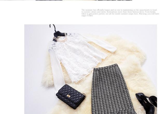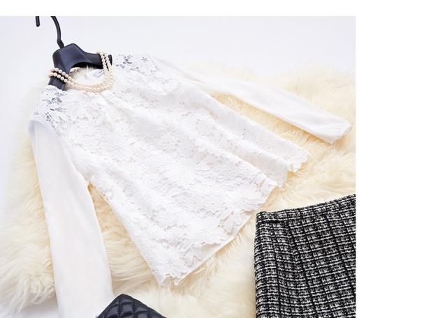 ● きちんとした印象のジャケットに、裾の広がりが愛らしいスカートのスーツ。華やかな白のレースが美しいブラウスとの3点セットです。遊び心きらめく個性派の一着。