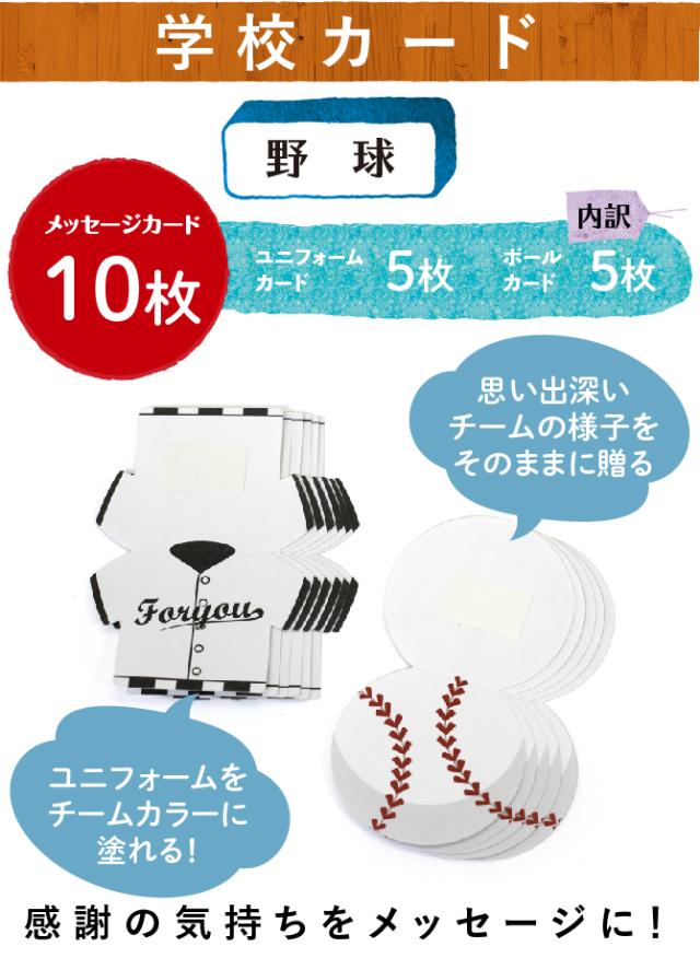 学校色紙・野球の追加カード10枚。学校色紙でセットされているカードで足りない場合にお買い求めください。野球ボールとユニフォームの形をしたメッセージカードにメッセージを書いて思い出を贈りましょう。 ユニフォームはチームカラーに塗る事ができます。