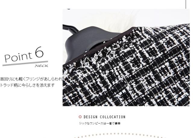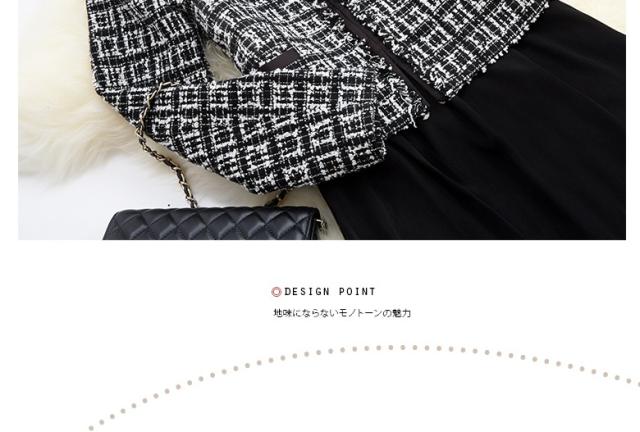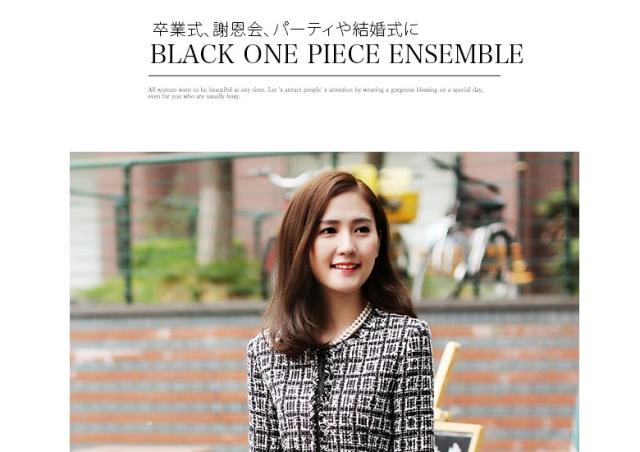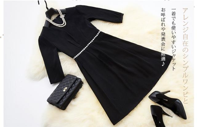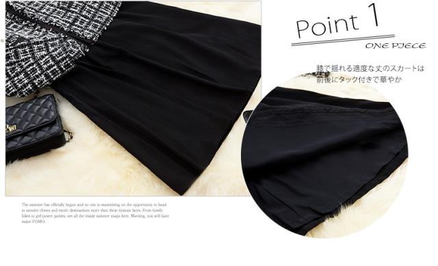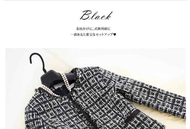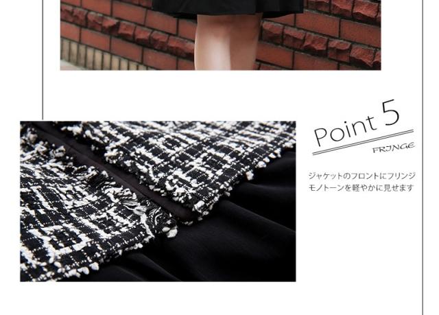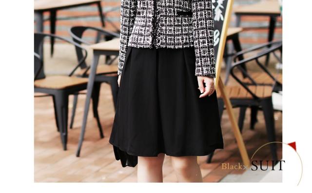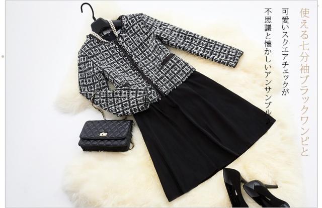 ●キュートな印象が鮮烈なワンピースアンサンブル2点スーツ、誰の目にも爽やかで愛らしい七分袖のブラックワンピースと、可愛いスクエアチェックのジャケットのセット。不思議な懐かしさを感じさせ、幅広い年齢層の方に好まれそう。