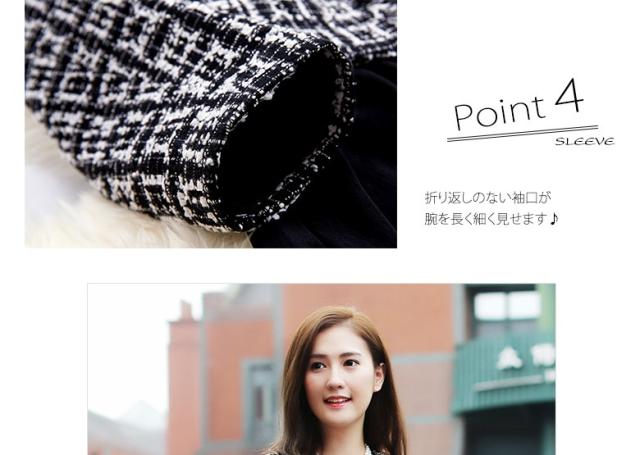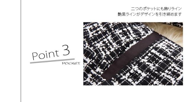 ● 前あきはボタンでなく、ホックだからフロントラインがすっきり。2つのポケットには漆黒のラインが、デザインを引き締めます。折り返しのない袖口が、腕を上品に長く見せます。