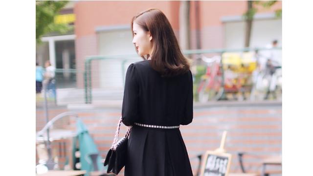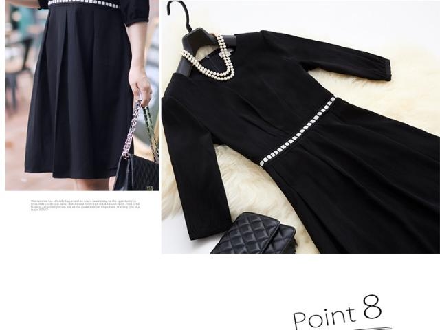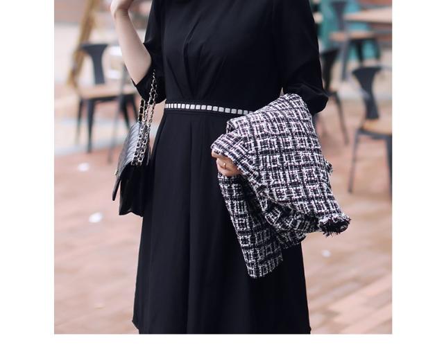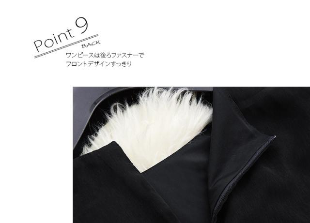 ● シックなワンピースは一着で豪華な印象。白い光沢のあるウエストマークが軽やかです。後ろファスナーで脱ぎ着するので、フロントデザインはすっきり。