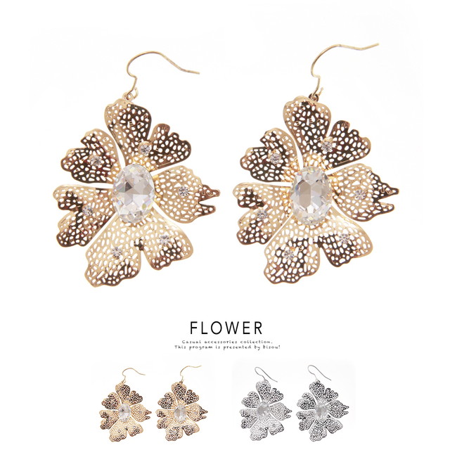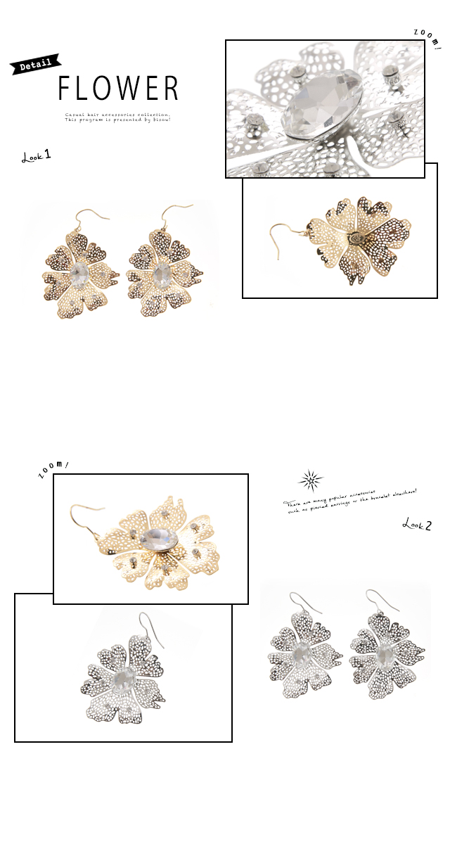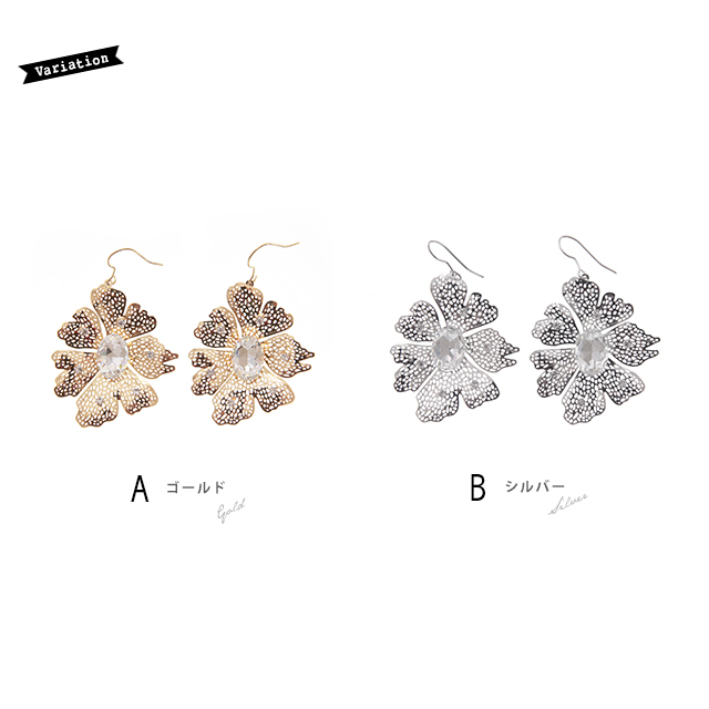 【透かしパーツのフラワーがおしゃれな大きめフックピアス】フラワー/ビジュー/ラインストーン/メタル/パーティー/アクセサリー