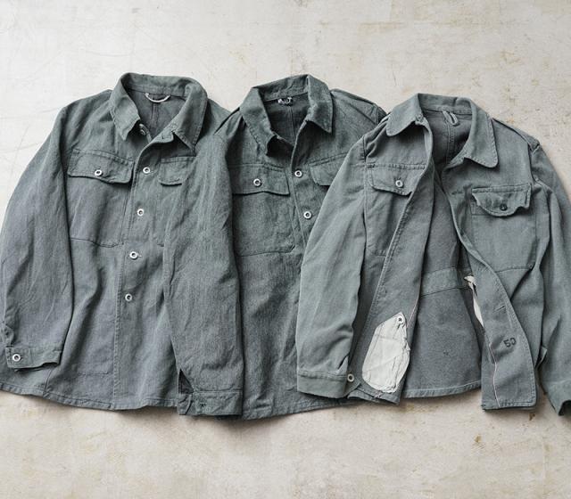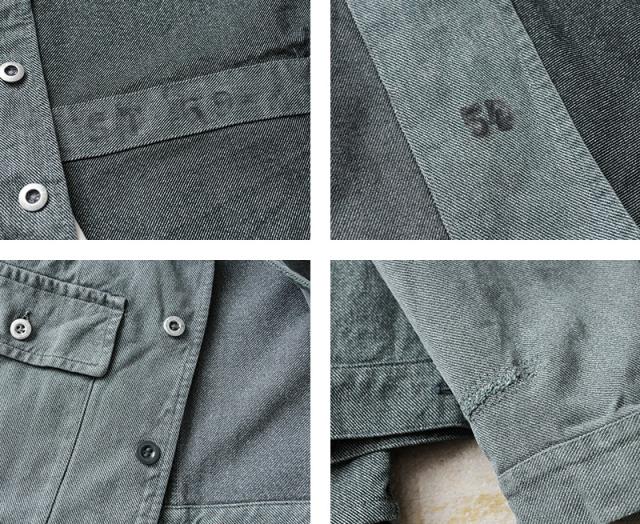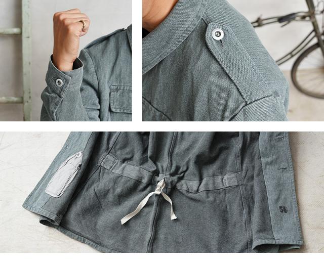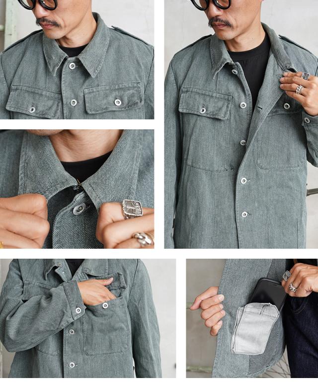 グリーンやブルーがかったグレーの絶妙な色目が特徴のデニム生地が使用されているワークジャケットで、独特な雰囲気を醸し出している一着です。デニムカバーオールのような感覚で着用したくなるデザインで、ワーク、アウトドアなどカジュアルなスタイルにハマるアイテムです。