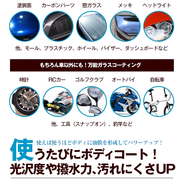 塗装面、ガラス、メッキ、モール、ゴム、プラスチック、ホイール、他。車体のあらゆるところに使えます。あっちもこっちも超撥水!