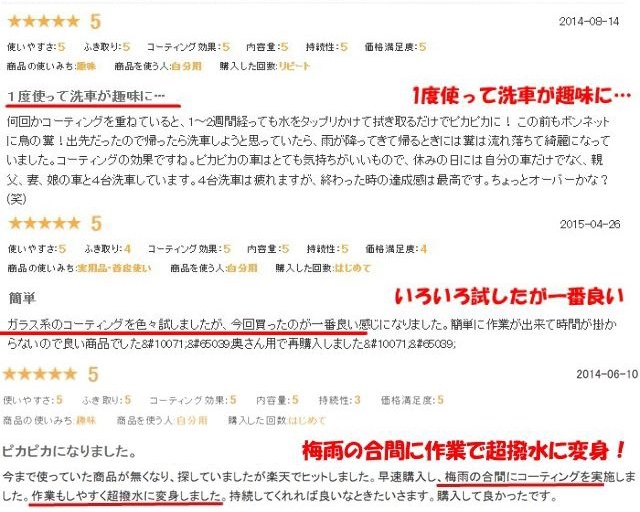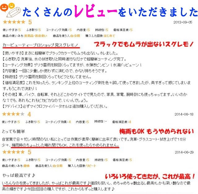 - さっそく使用しました。コーティングのノリが良く洗車後すぐに使用できるので重宝してます。持続力をみて、又購入します。